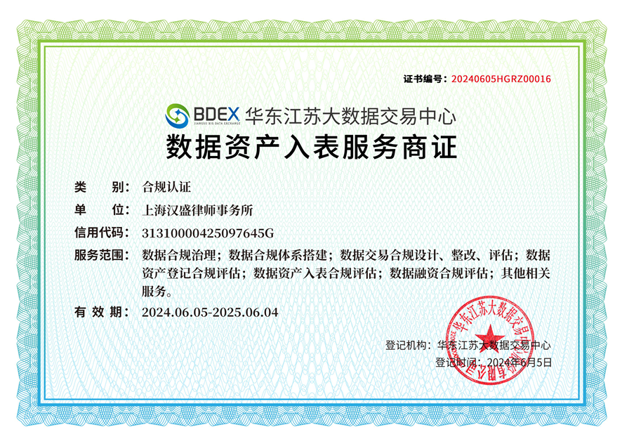 作为国内最早接触数据交易相关法律服务的数据服务商之一,汉盛于2021年为上海数据交易所首批挂牌的数据产品提供合规评估专项法律服务。