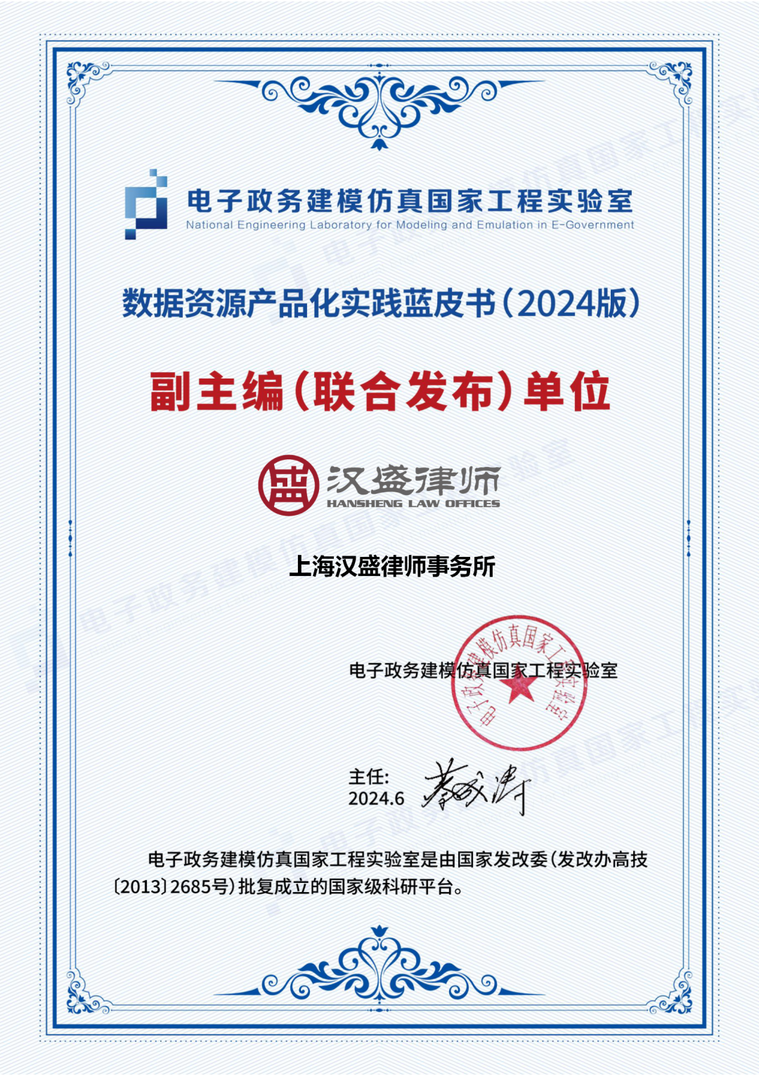 经过数月的不懈努力,由电子政务建模仿真国家工程实验室筹划打造的《数据资源产品化实践蓝皮书(2024版)》当前已正式上架各大平台。上海汉盛律师事务所作为参编单位一同助力蓝皮书的编制工作,为政府和企业提供具体的实践路径和方法。